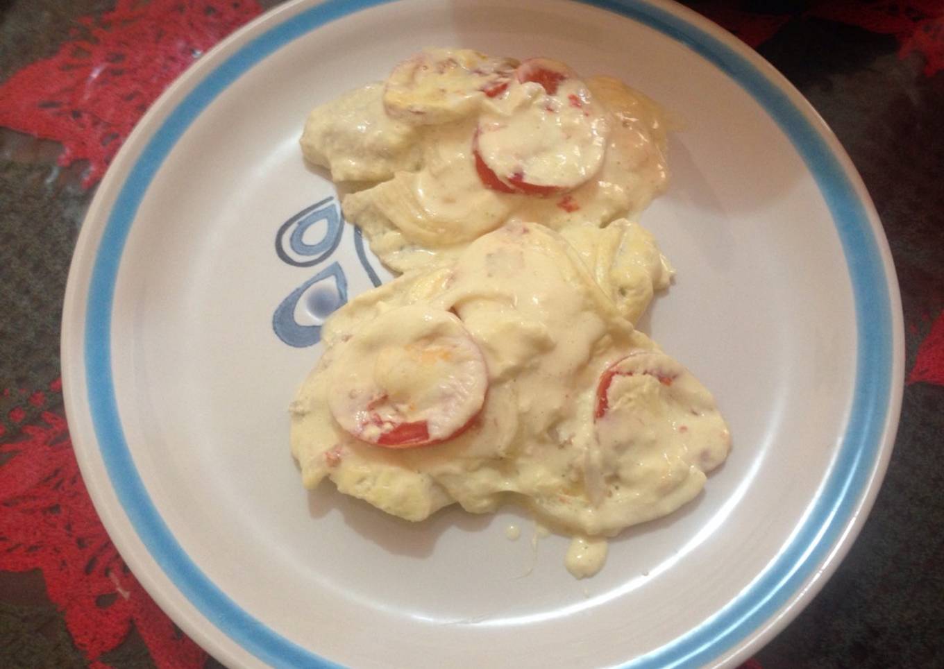 - Ponemos en un sartén el filete condimentado, le ponemos la crema y las rodajas de tomate y cebolla y por último el queso, tapamos el sartén y cocinamos por 25 minutos a fuego moderado