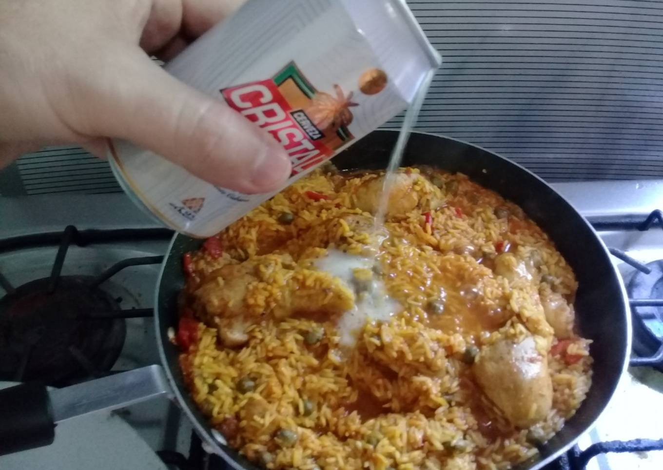 - Una vez dorado el pollo añadir el puré de tomate, las 3 tazas de agua, el colorante y la taza y media de arroz previamente lavado y las alcaparras.