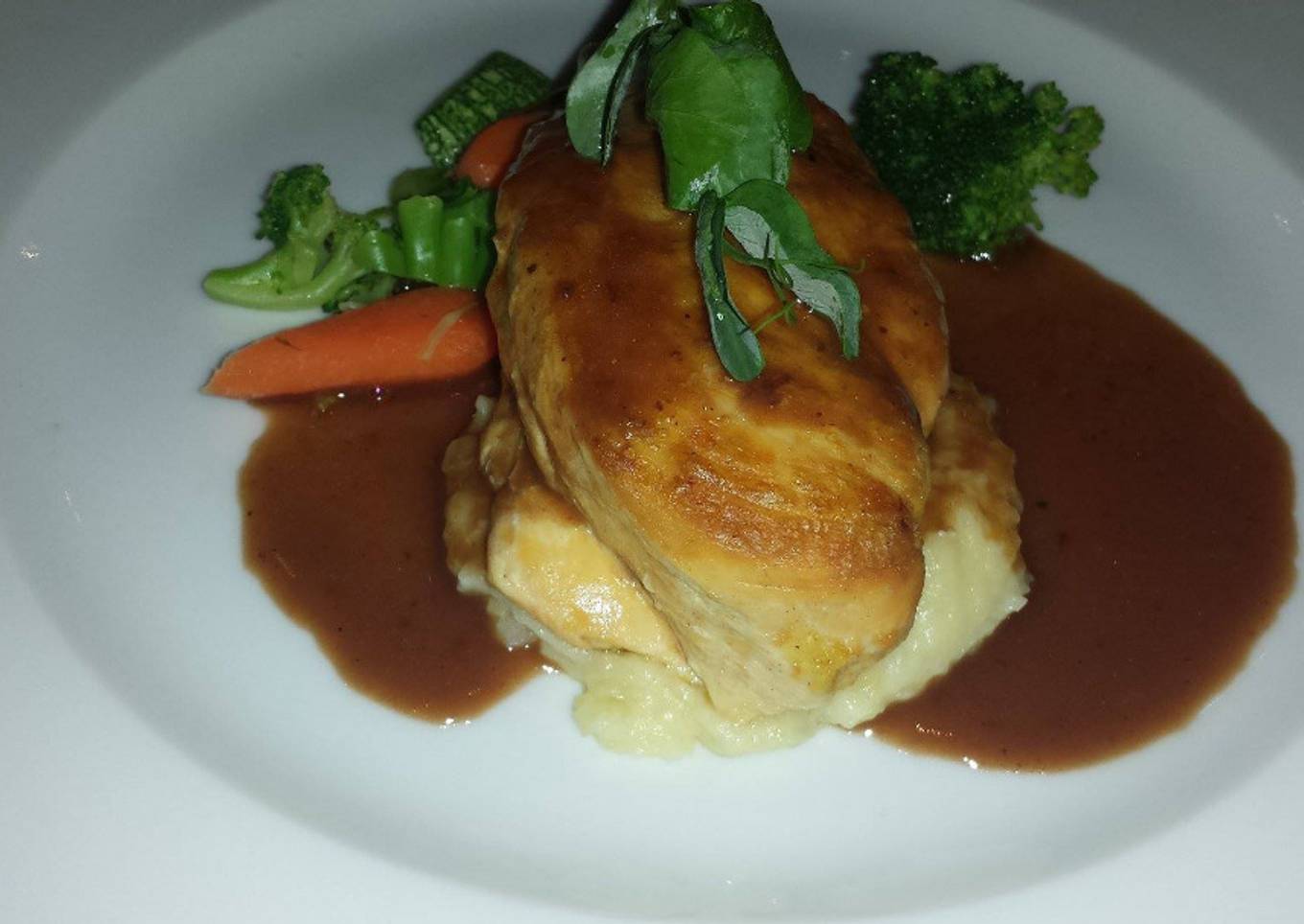 - Baña las pechugas con la salsa de vino y listo. yo la acompañe con un puré de papa y verduras salteadas.