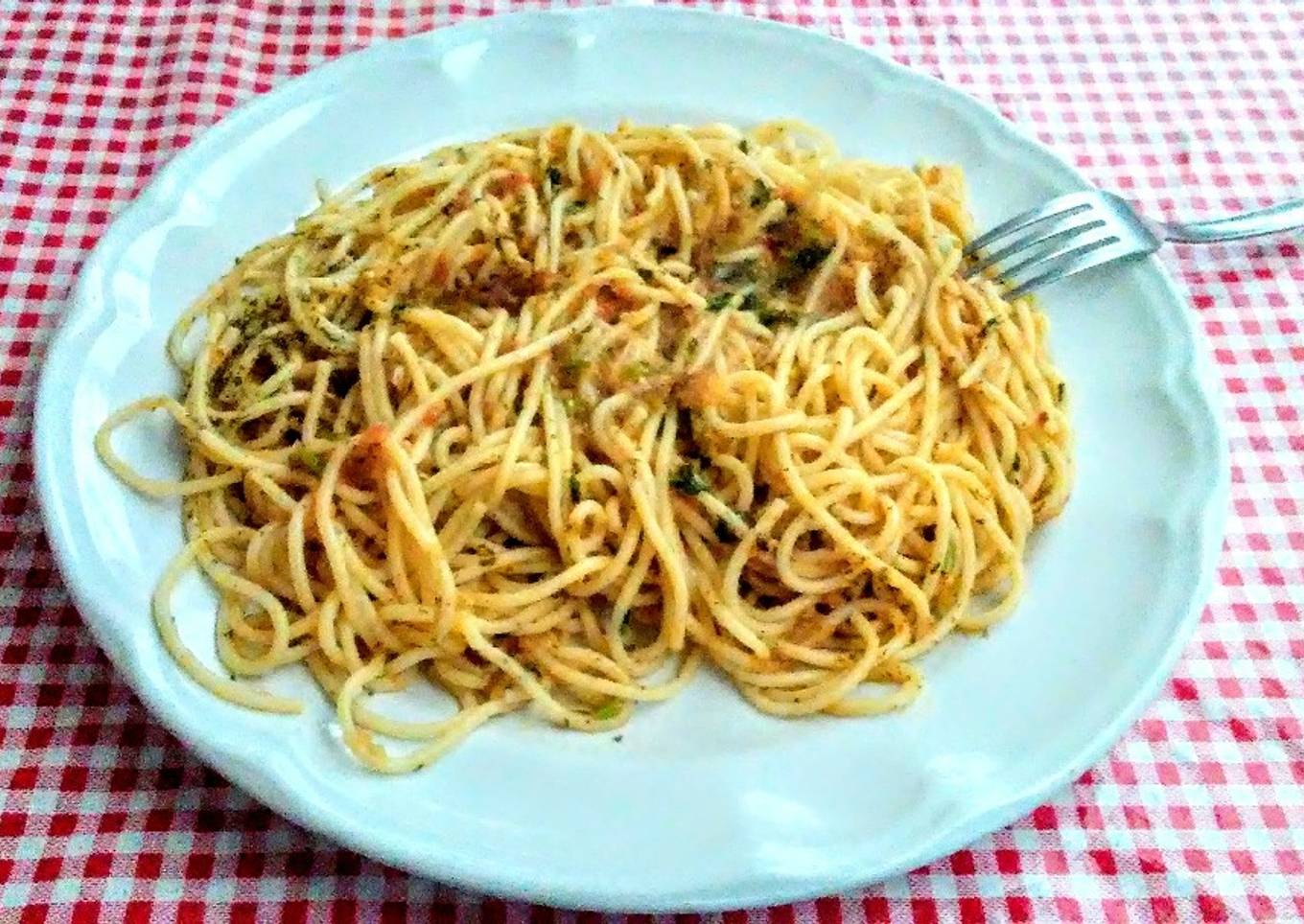 - Agregar los 150 Gramos de spaghetti y mezclar con la salsa, añadir también la otra porción de perejil.
