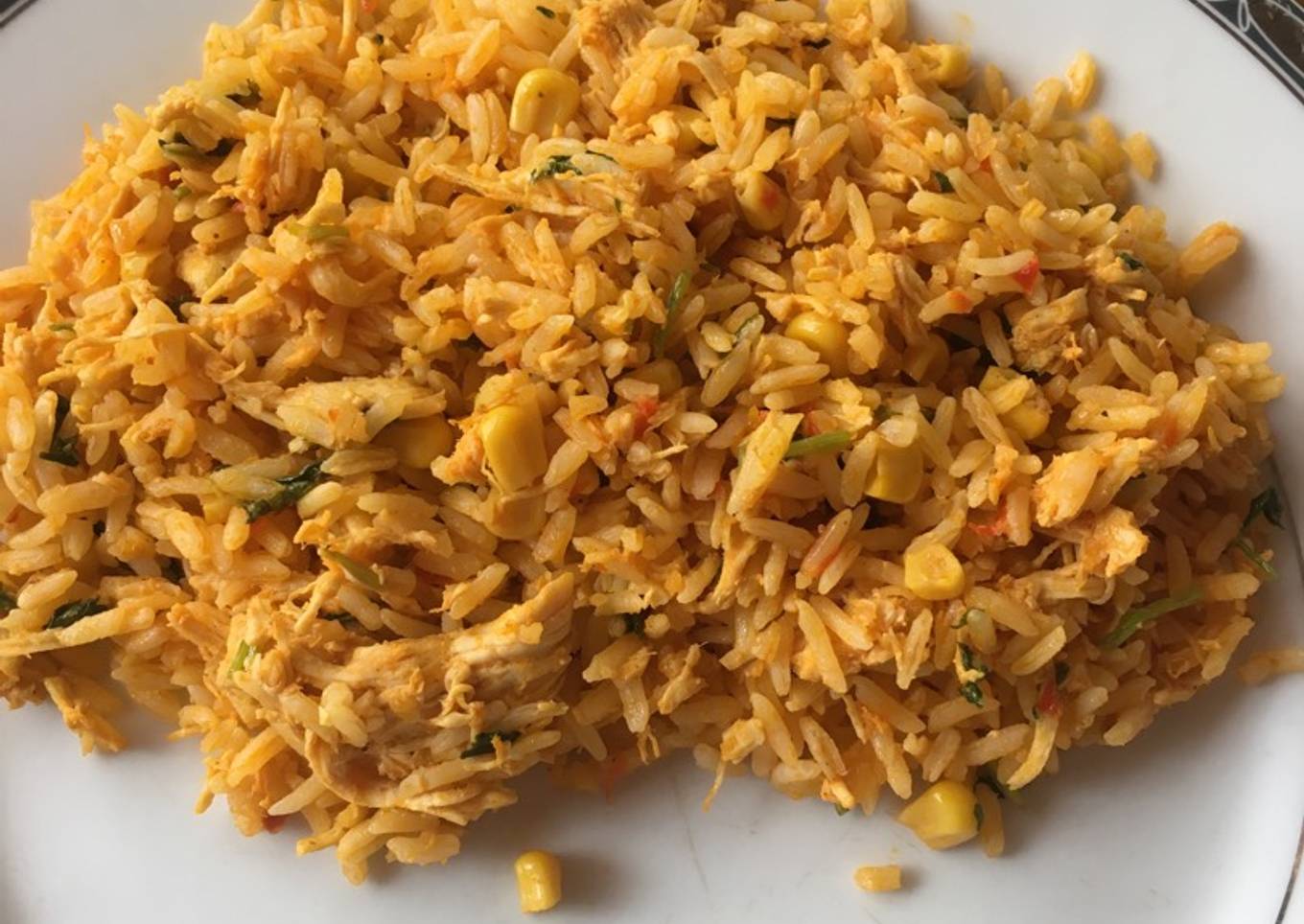 - En una olla grande a fuego medio agregamos el aceite, la cebolla, el chile, los ajos y el achiote freímos agregamos el caldo de pollo solo una taza, el consomé y la ketchup mezclamos bien y agregas el pollo dejar cocinar por 5 minutos y finalmente incorporas el arroz, el maíz y el culantro mezclando bien dejas otros 5 minutos más que el arroz quede seco. Por eso hay que calcular muy bien la cantidad de caldo de pollo.