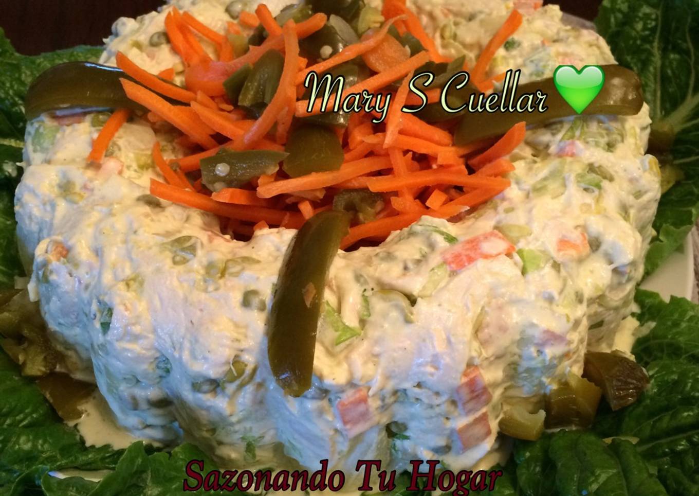 - Busca tu molde para rosca el que mas te guste y engrasa con una servilleta y agrega la ensalada bien aplanadita y tapas y refrigeras 1 hora en un plato decoralo con hojas de lechuga y desmonta tu rosca de ensalada decoras el centro con zanahoria rallada y jalapeños 😋😋 · Ajusta la cantidad de mayonesa y crema al gusto...yummii👌🏻👌🏻Enjoy😋😋