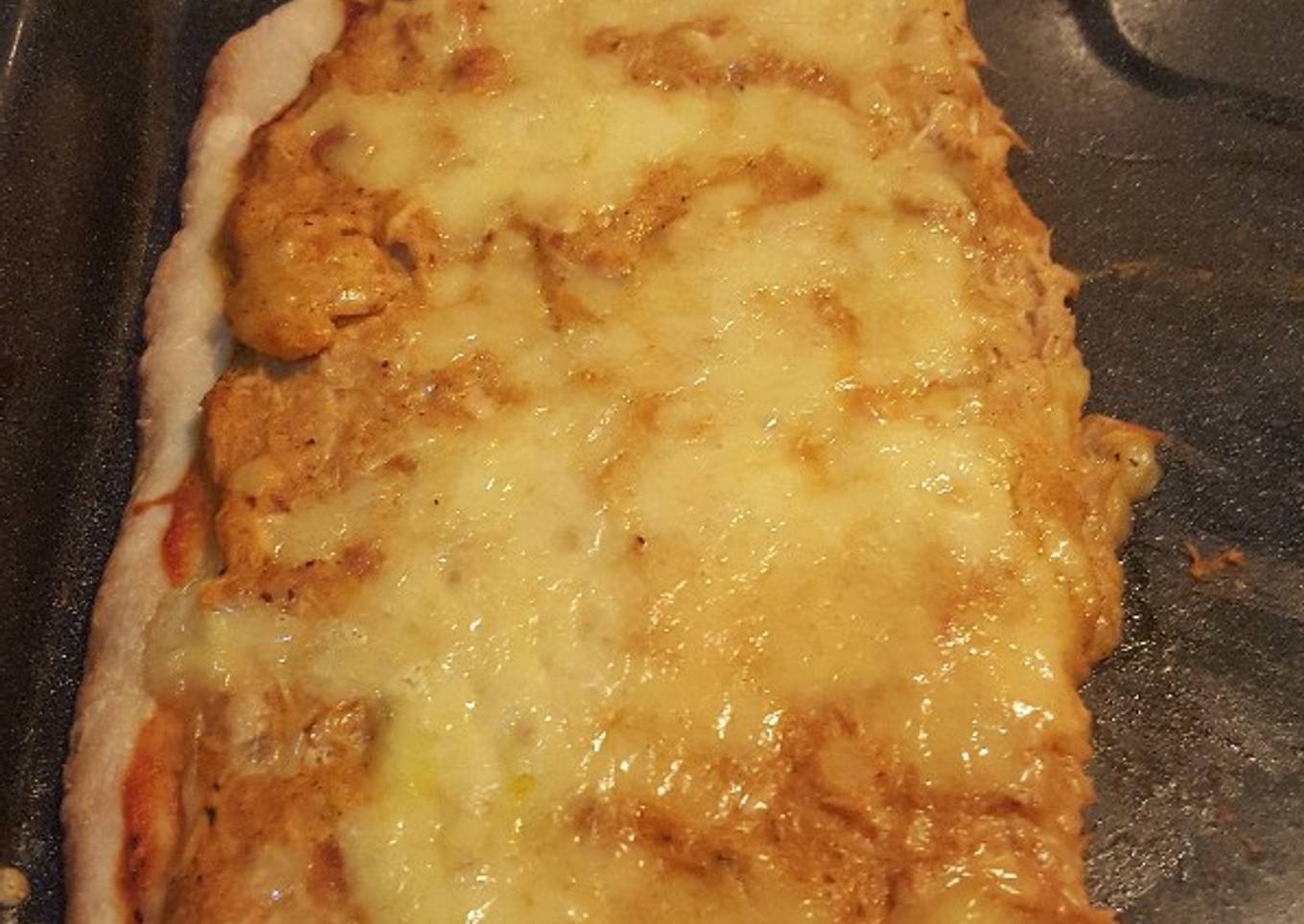 - En una bandeja para horno engrasada extender la masa con las manos. Llevar al horno por 10 minutos. Pasado ese tiempo sacar del horno y agregar la salsa de tomate queso, el pollo, la crema de leche y más queso parmesano rallado por encima. Llevar al horno por 15 minutos más.