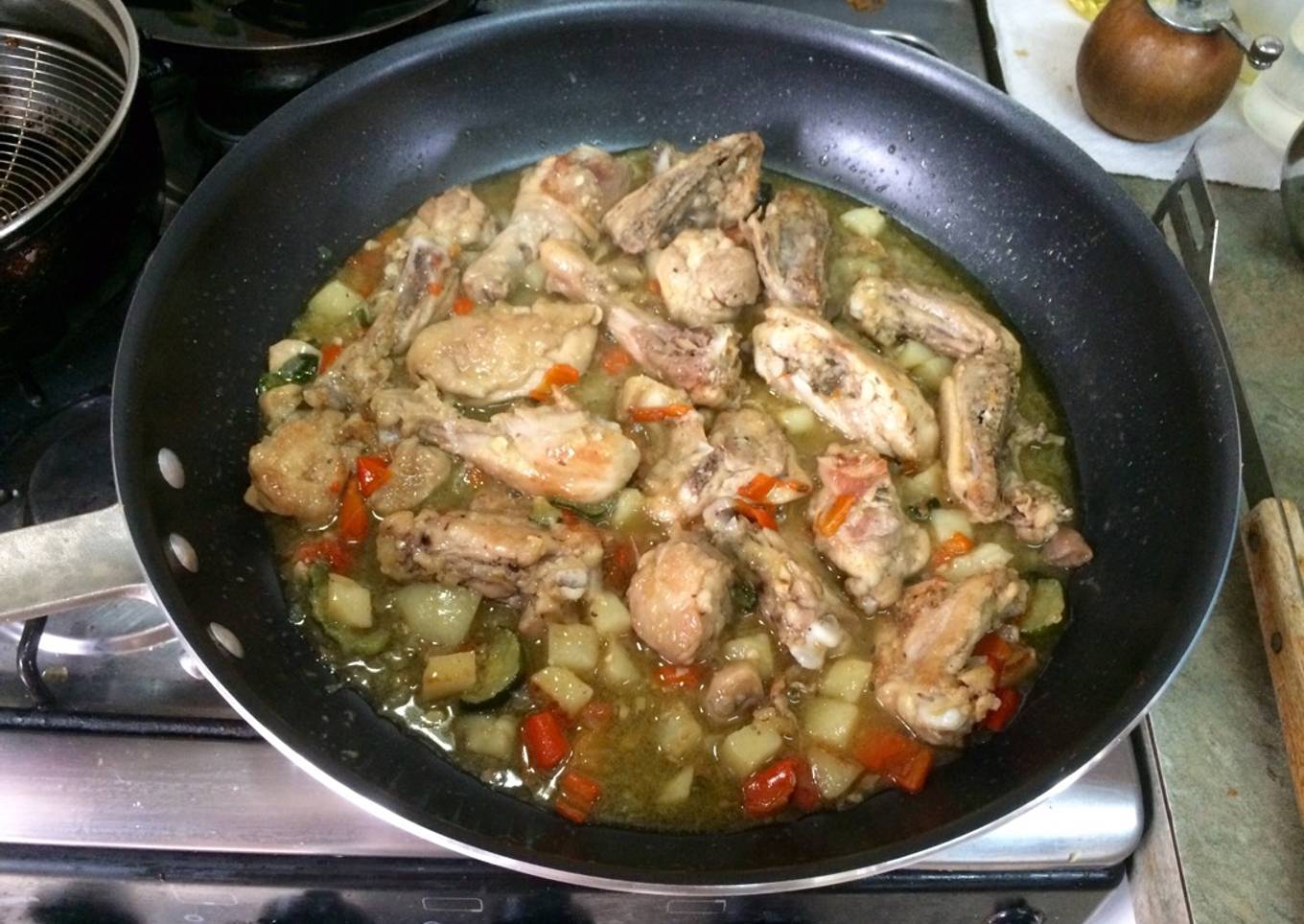 - Sartén grande, calentamos aceite y doramos tenuemente las papas, reservamos. Sofreímos el ajo y cebolla a fuego medio, ahora doramos las presas de pollo. Agregamos el cilantro y el zuchinni, devolvemos las papas, integramos todo y agregamos el jugo del pollo. Tapamos a fuego bajo, cocinamos hasta que el pollo este cocido, será rápido pues lo cortamos en pedazos pequeños.