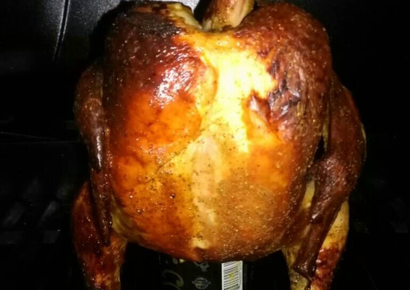 - Precanlentar la parrilla, o el horno, en introducir el pollo sentado en la lata de cerveza (violado) a fuego indirecto dejar asar entre 45 a 60 minutos.