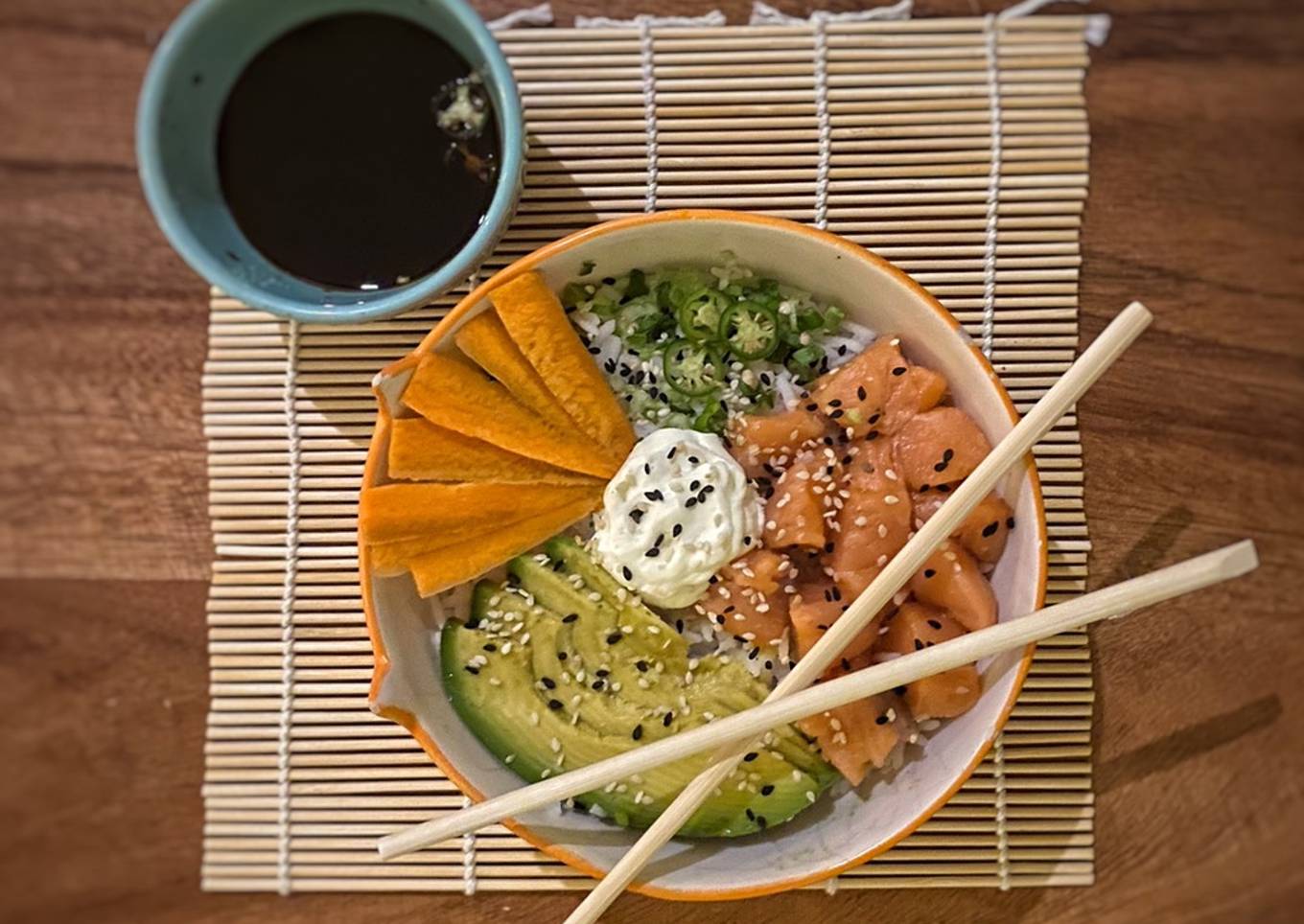 - Armamos el bowl con el arroz, el queso philadelphia, el salmón, el aguacate, la zanahoria, la cebolla cambray, el chile y las semillas de sésamo. Aderezar con salsa de soya con chile.